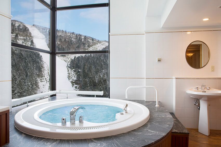 1フロアに4室のみ、全200室あるゲストルームはそのすべてがスイート。広さ100平方メートルを超える広々とした部屋には、展望ジェットバスとプライベートサウナを完備。寒いときはマイナス30度にまで下がる外気温の環境下で芯から温まる、最高の贅沢である。