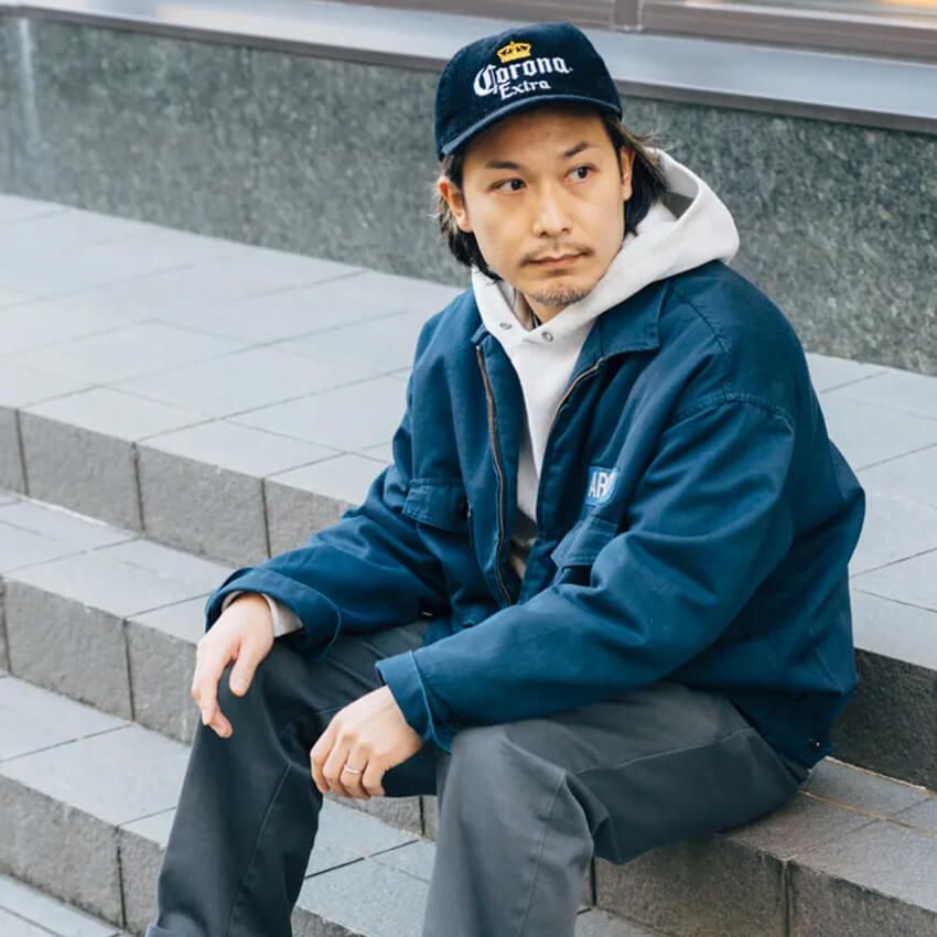 ジャケット、ニット=ともに古着 デニム=カーハート シューズ=ローリングダブトリオ 帽子=ダッパーズ 眼鏡=アヤメ