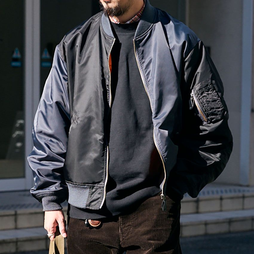 例えば、MA-1は青と黒という定番色によるアシンメトリーデザイン、パンツは表情のあるコーデュロイ素材、スウェットの襟からはチェックシャツをちょい出し。ナイジェルケーボンのバッグやダナーの革靴といった男らしいアクセントにもご注目を。タフでユニークなアメカジスタイルの完成だ。