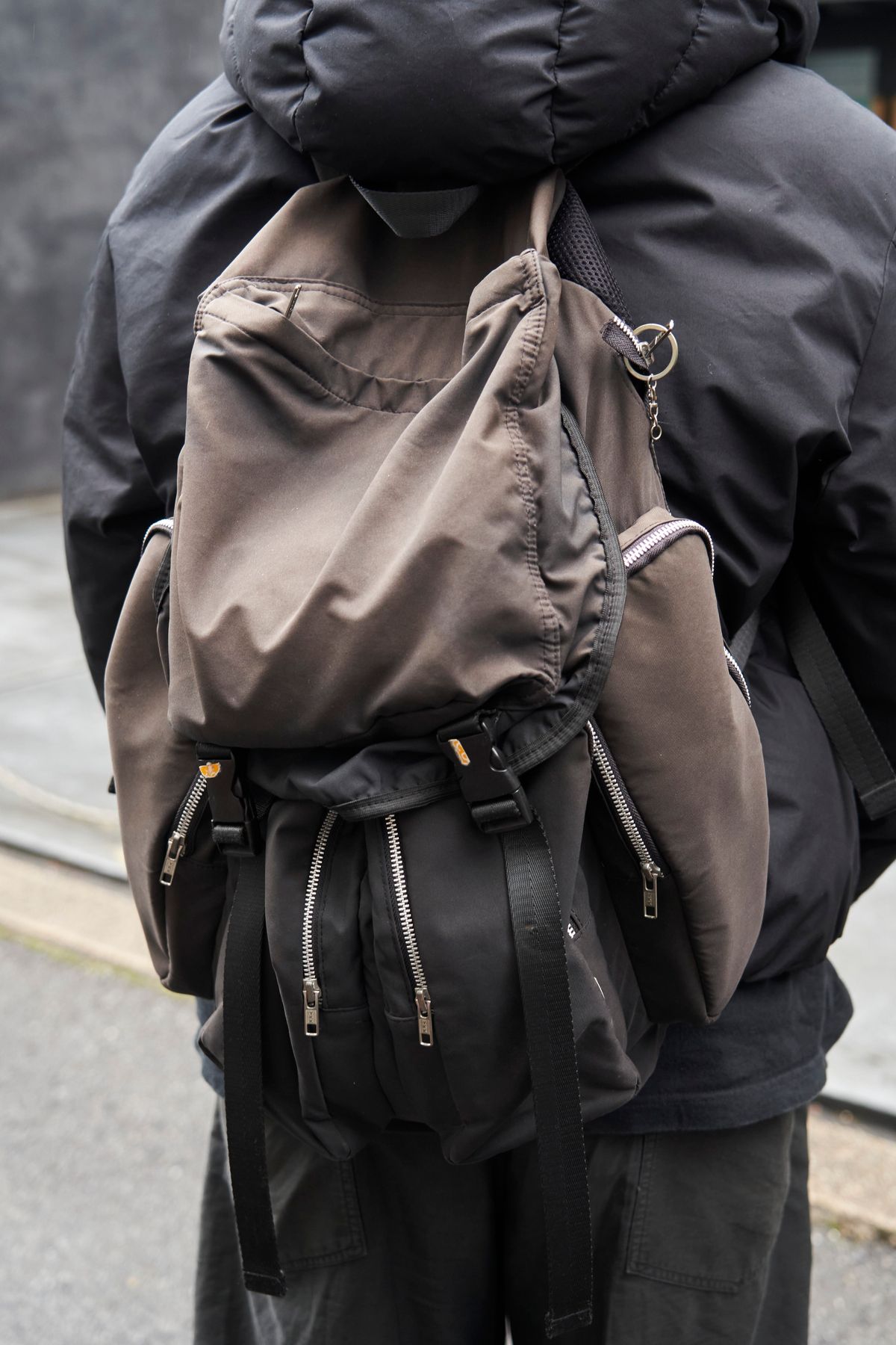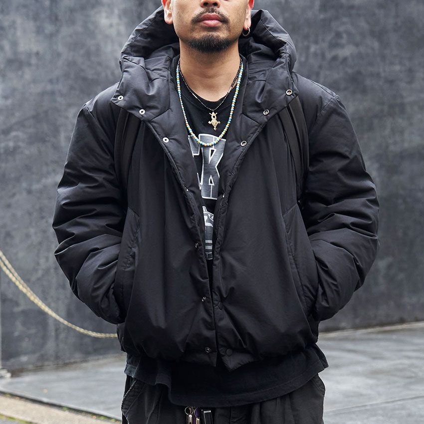 ▶︎タカさんのスナップをすべて見るタカさん(34歳)ボリュームのあるダウンジャケットにダボっとしたパンツを合わせたストリートスタイルを黒くまとめることで緊張感のある装いに。色みが少ないからこそアクセサリーが際立つことも熟知しており、ネックレスやバックパックがいいアクセントとなっている。足し算と引き算をうまく活用したコーディネイトだ。