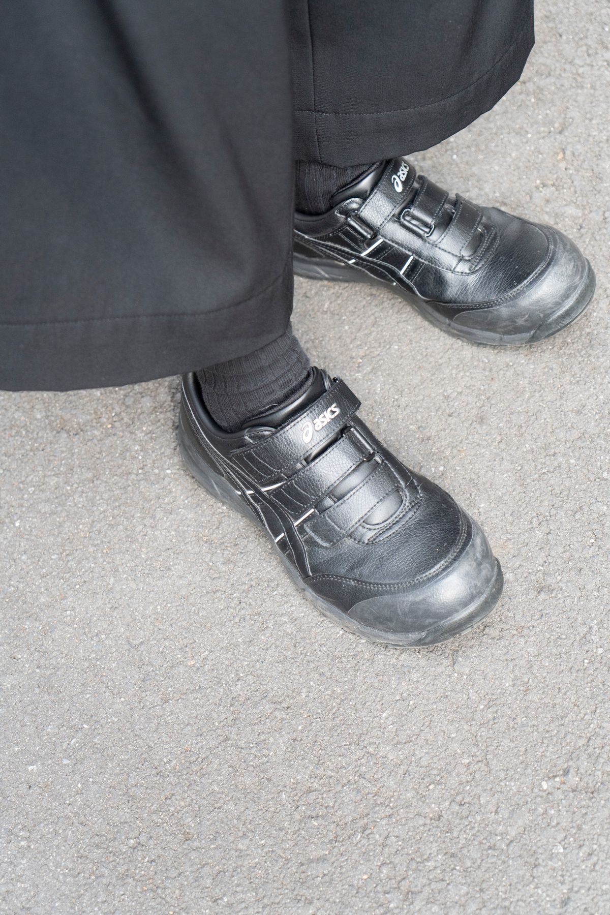 足元にはボリューミーなスニーカーを、首には大判のマフラーを用いることで、ゆったりとした全身の見た目に負けないポイントを設けているのが匠のワザ。心から黒がお好きなんだなぁ、と脱帽!