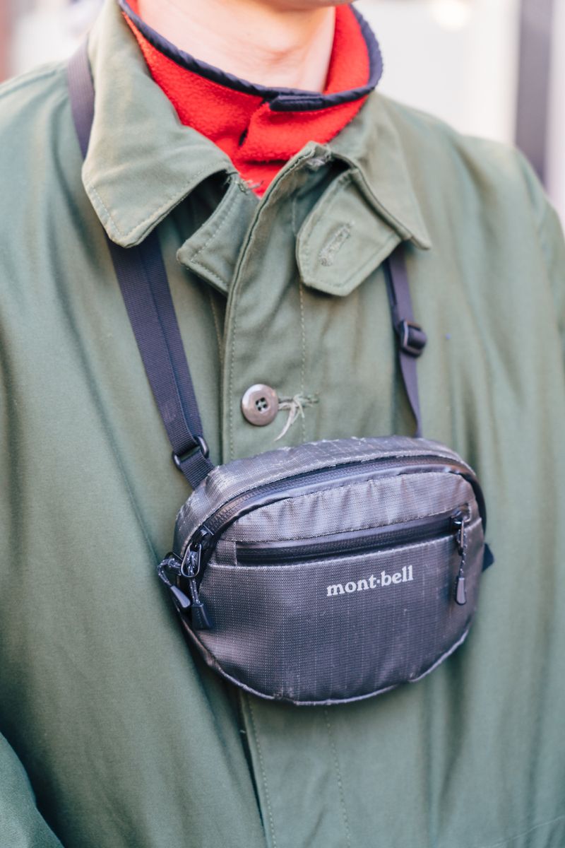 ▶︎鷲見さんのスナップをすべて見る鷲見 教さん(35歳)こちらもモンベルのミニバッグを愛用中。軍もののコートにパタゴニアのフリース、ブーツカットのデニムを合わせるなどどこか懐かしさを感じる装いだ。そんなアジありコーデのワンポイントとしてモンベルを投入。ベルトポーチと思しきバッグをあえて首から下げることで無二の個性を演出した。