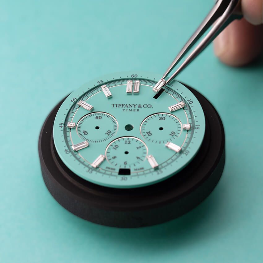 本作はティファニーを象徴する“ティファニー ブルー”のラッカー文字盤を採用。これは50時間以上かけて丁寧に仕上げられ、複数のラッカー層と透明なバーニッシュ層が重ねられることで奥行きと光沢を持たせた技術の結晶でもある。