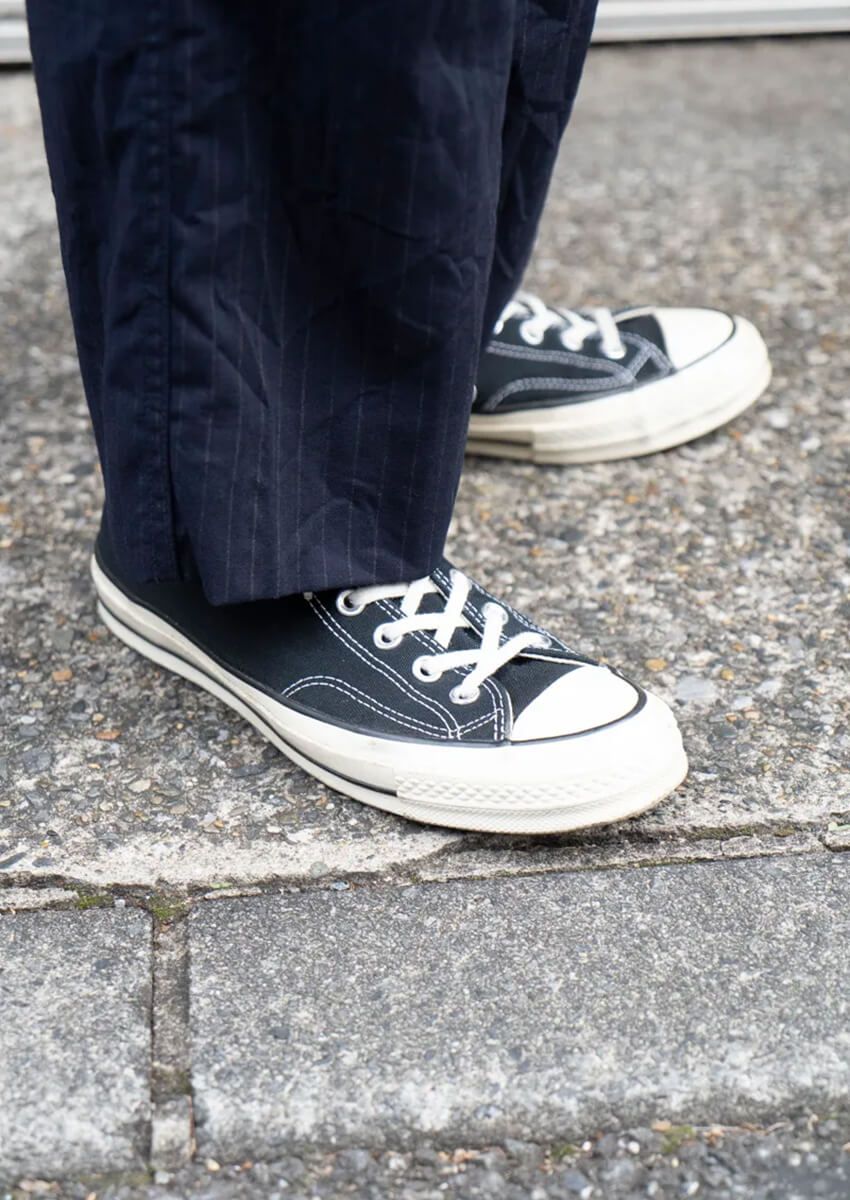 黒いコンバースのローテクスニーカー。色もブランドもカタチも王道だけに、コーディネイトのメソッドは多彩だ。だからこそ自分の色が出しやすく、ちょっとしたアレンジが大きな差になる。街角の絵になるアイデアをヒントに、もっと“黒コンバース”を楽しもう。