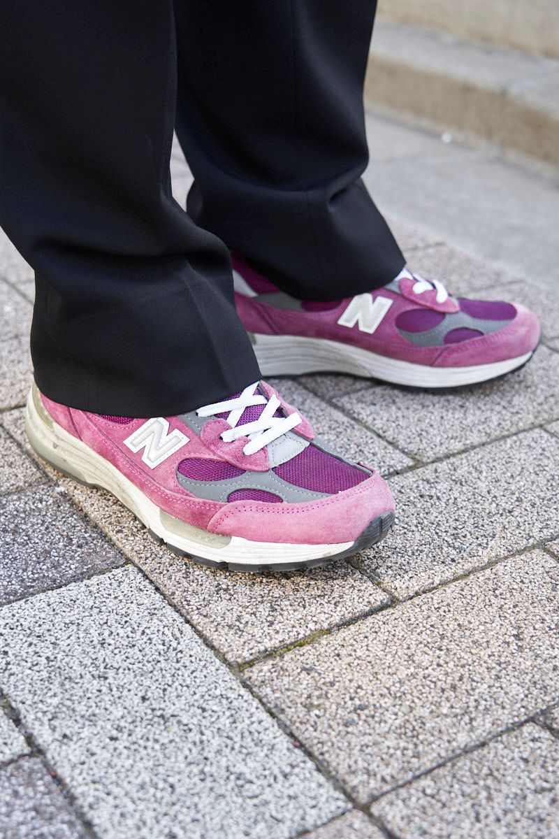 それどころか、足元にビビッドな「M992BA MADE IN USA」を合わせてさらに個性をマシマシ。ご本人のキャラクター込みで初めて完成する上級者コーデ、一朝一夕には真似できないかもしれない。けど、そこに痺れる、憧れる!