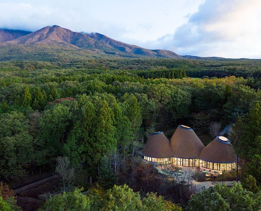 施設前では焚き火で使用する薪割りや火おこし体験もできる。室内ではBooks&Cafeをはじめ、石窯ピッツァづくりやキッズエリア、子供がパティシエになりきってケーキ作りを体験するリゾナーレキッズスタジオなど、さまざまなシーンが楽しめる。3つの円錐形が重なり合う大屋根が特徴の建築デザインも遊び心をくすぐる設計だ。