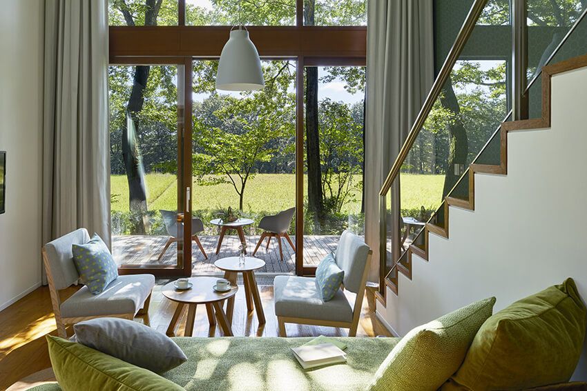 那須の大自然をテーマとしたゲストルームは生い茂る緑をイメージし、落ち着いた空間の大きな窓からは四季折々の景色が楽しめる。複数ある部屋タイプの中でもおすすめなのは“田んぼビュー”のゲストルームだ。