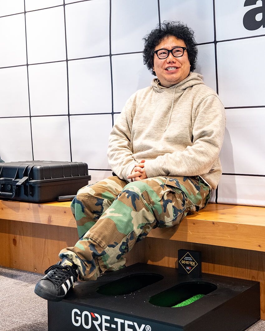 OCEANSのYouTube連載「業界人! スニーカーハンター」に出演中のスタイリスト・平さんもパパラッチ! 自身が手掛けるアウトドアブランド「Tスペックギア」のパーカに、「グリップスワニー」のカモカーゴをコーディネイト。足元は「アトモス×ゴアテックス」の黒スーパースターで引き締めて。