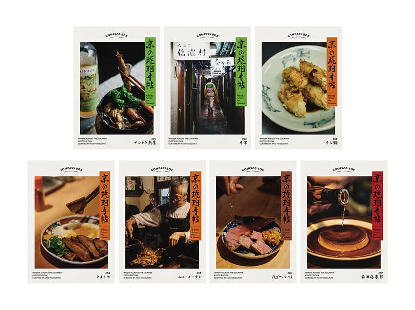 このキュレーションを担うのは、ファッションディレクターとして活躍し、独自の審美眼を持つ長谷川昭雄氏。彼がピックアップした今の京都を象徴する7つの酒場で、その店のムードにぴったりな1本をセレクト。特別な一品料理とともにコンパス ボックスのウイスキーを楽しむことができる。