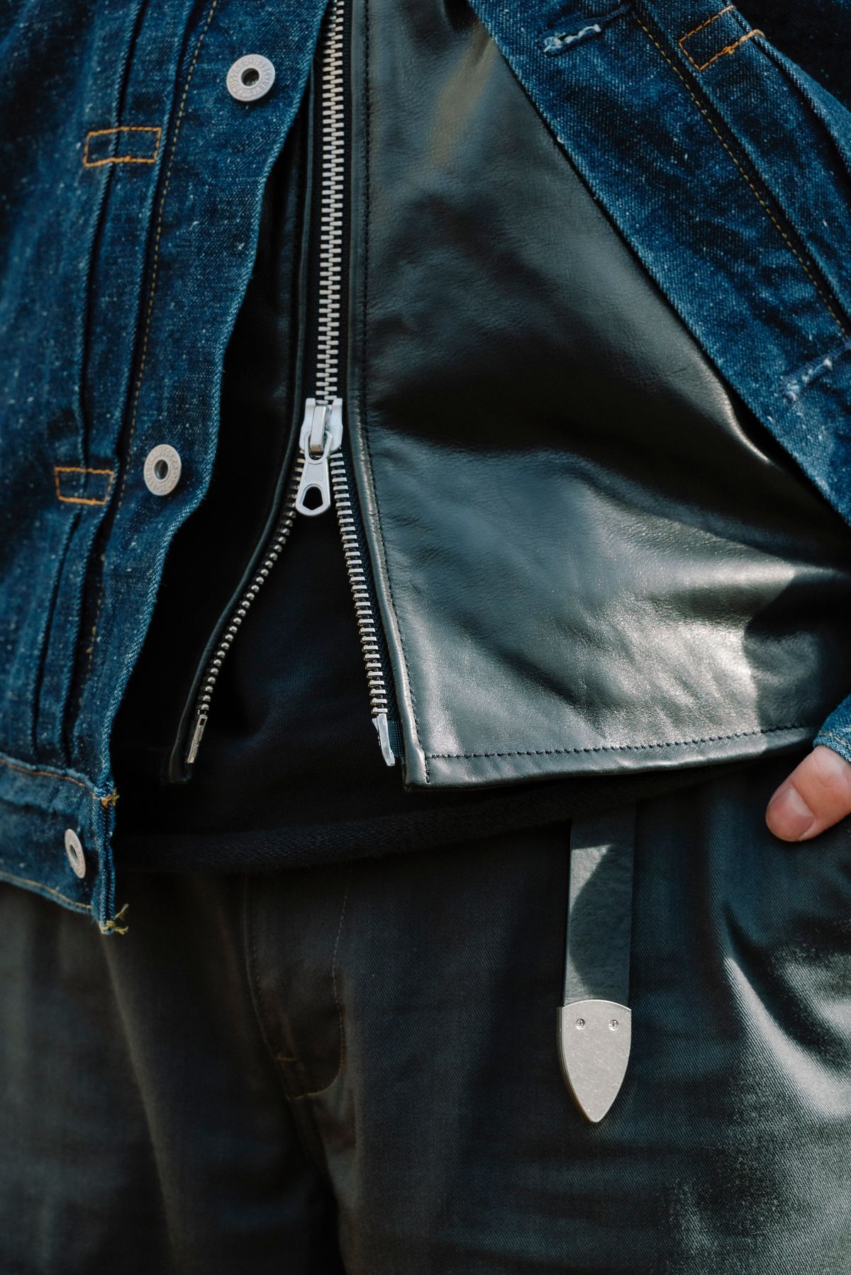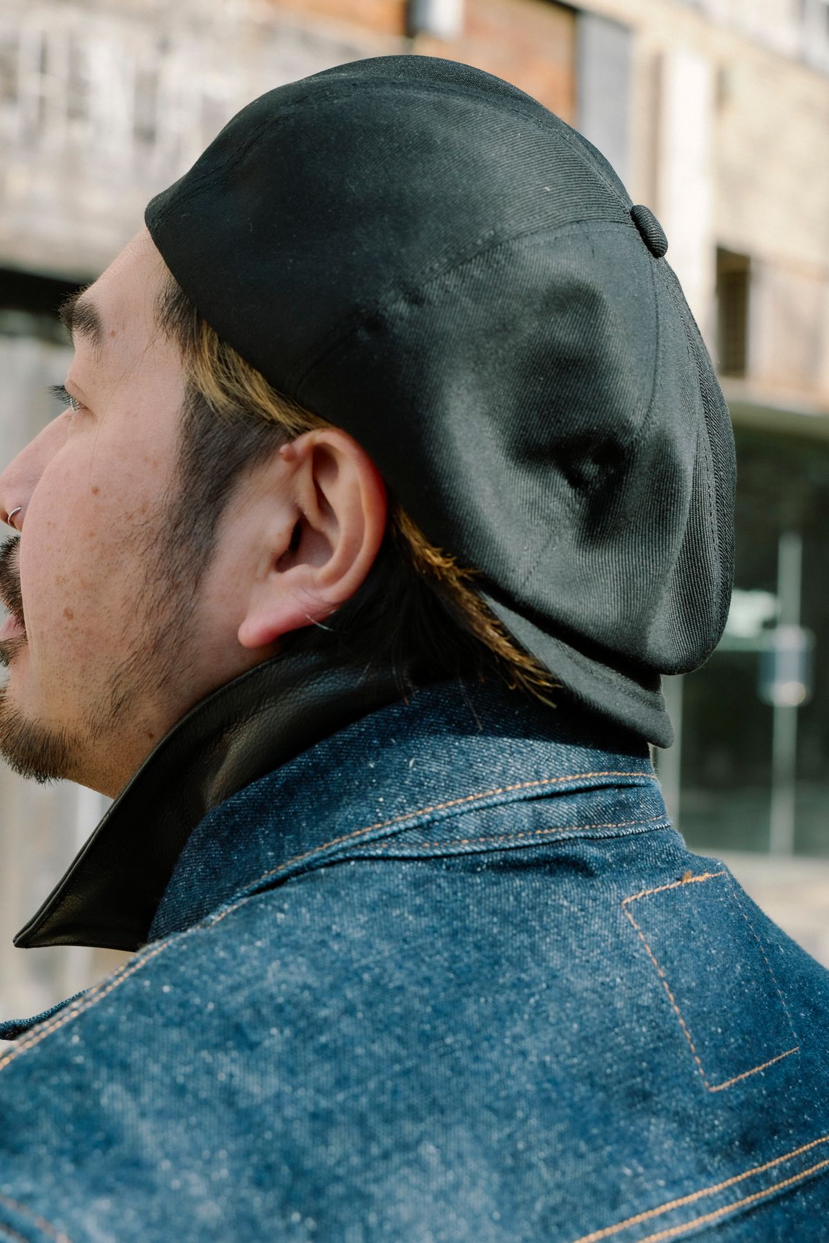 その風貌にさらなる重しを加えるのが、レザーの落ち着いた雰囲気。インナーの襟はユニークに覗かせ、シューズは定番のポストマン。キャスケットの後ろ被りも粋だ。