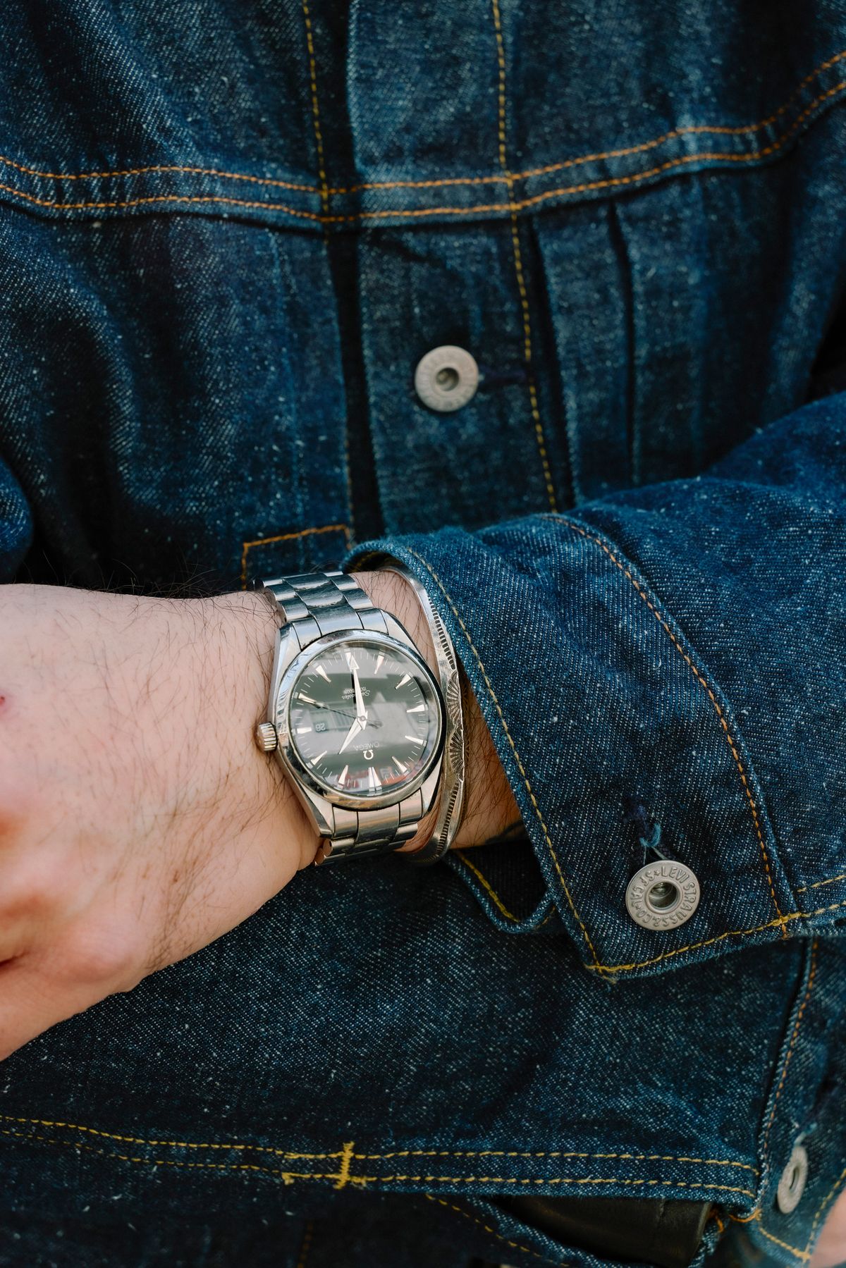 Gジャン、パンツ=ともにリーバイス ジャケット=フリークスストア シューズ=レッドウィング 帽子=シーピーエイチ バッグ=ノーブランド 腕時計=オメガ アクセサリー=タディアンドキング