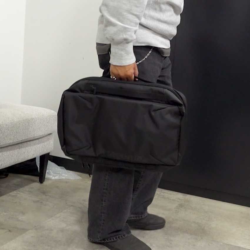キクチ 仕分けはもう完璧。出張だったり一泊だったり。見え感は全然ビジネスでも使えるし、3-WAYにもなるんだ。