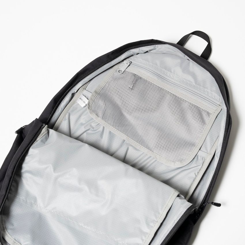 ディライトパック 17L」。値段は7500円。しっかりとした生地でシンプルなデザインに仕上げたデイパック。内部にPCや書類などの収納に便利なポケットを備え、普段使いから低山ハイクまで幅広く活躍します。大きなフロントポケット、書類やPCを入れる背面ポケット、メッシュの小物ポケットなど収納力も優れています。