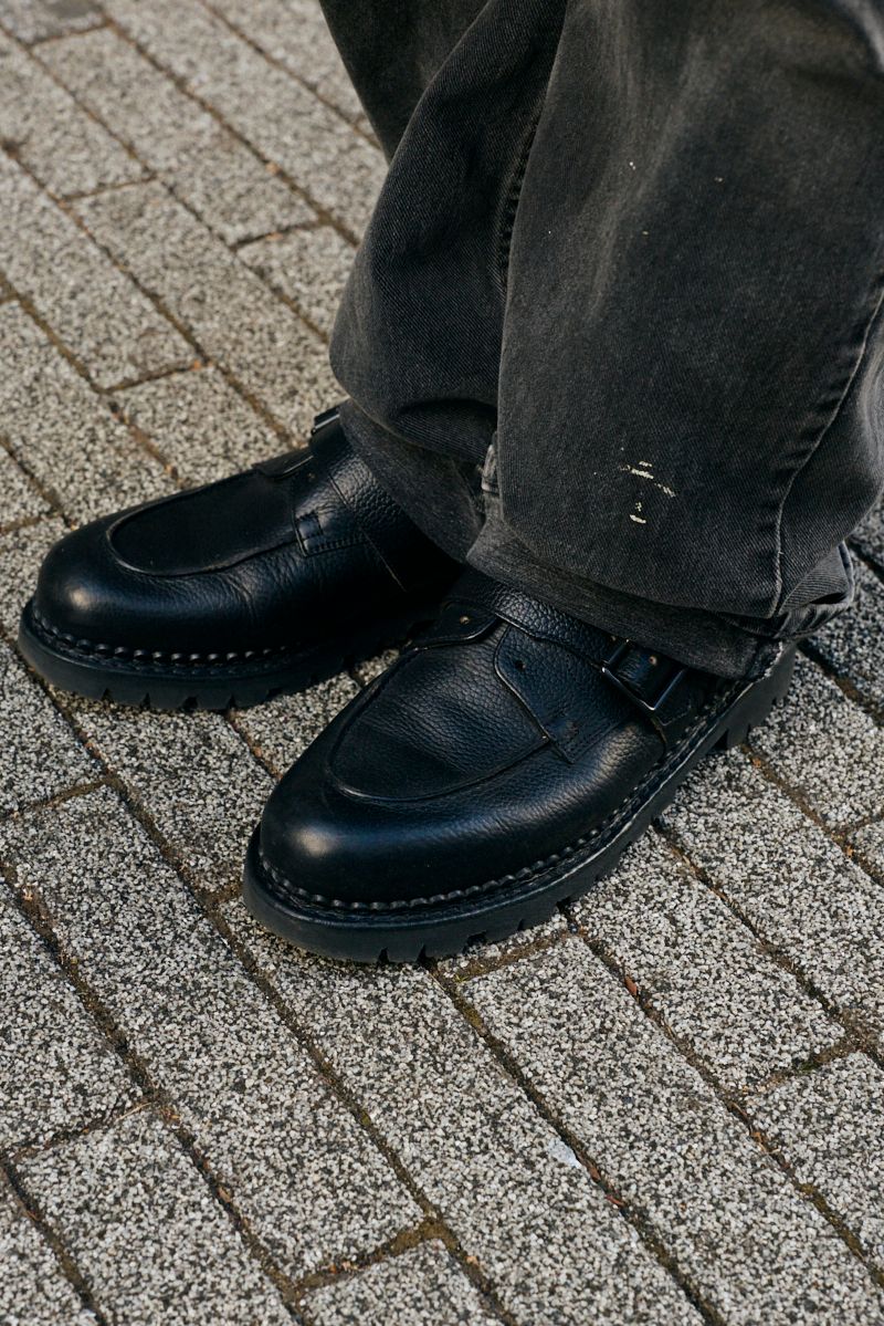 程良くゆるめのブラックデニムとこれまた“ガーメンツコラボ”の主張あるUチップシューズによって、キリッと辛口な装いのベースを作っているのだ。