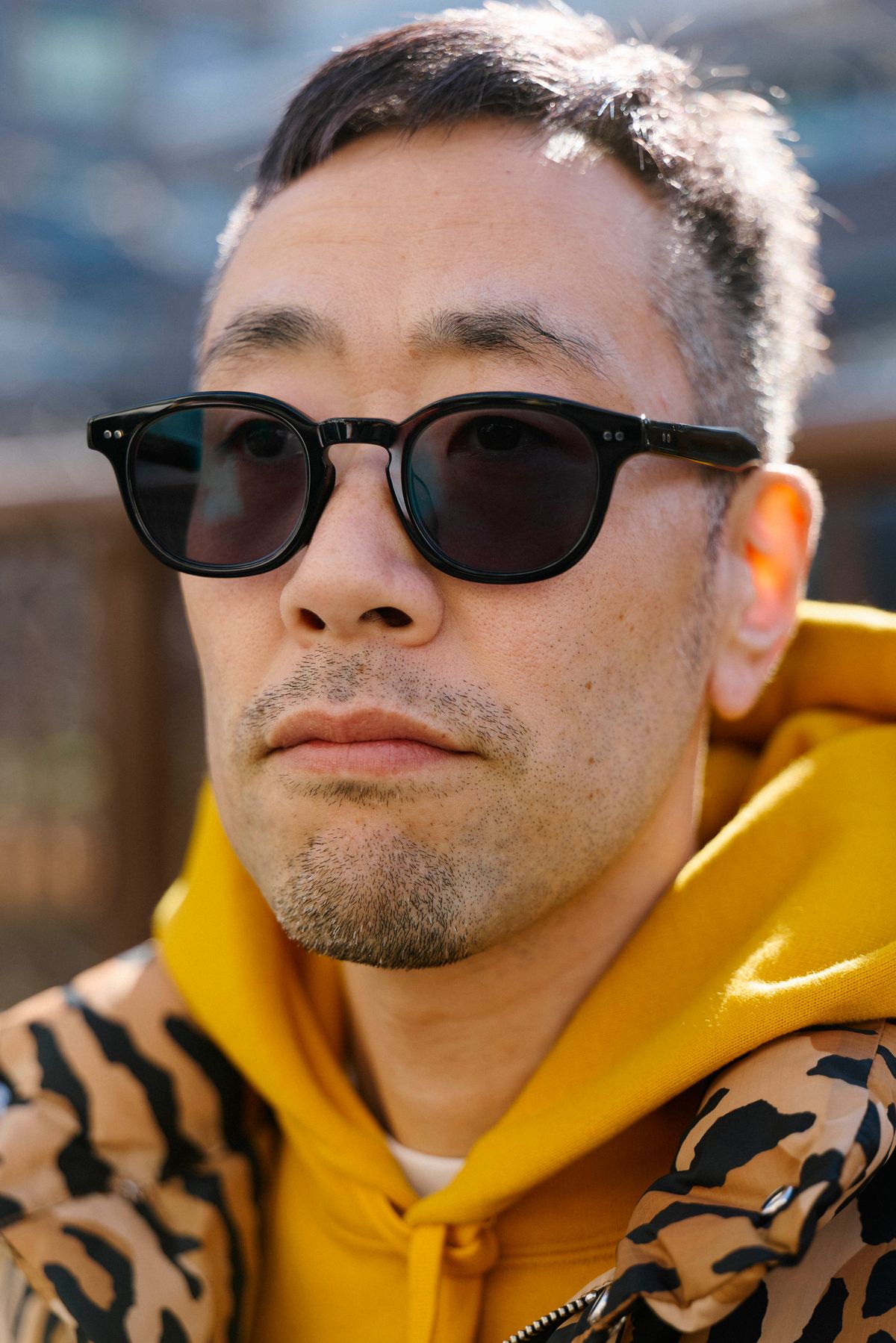 ジャケット、ニット、パンツ=すべて古着 シューズ=ナイキ 帽子=ニューエラ 眼鏡=レスザンヒューマン