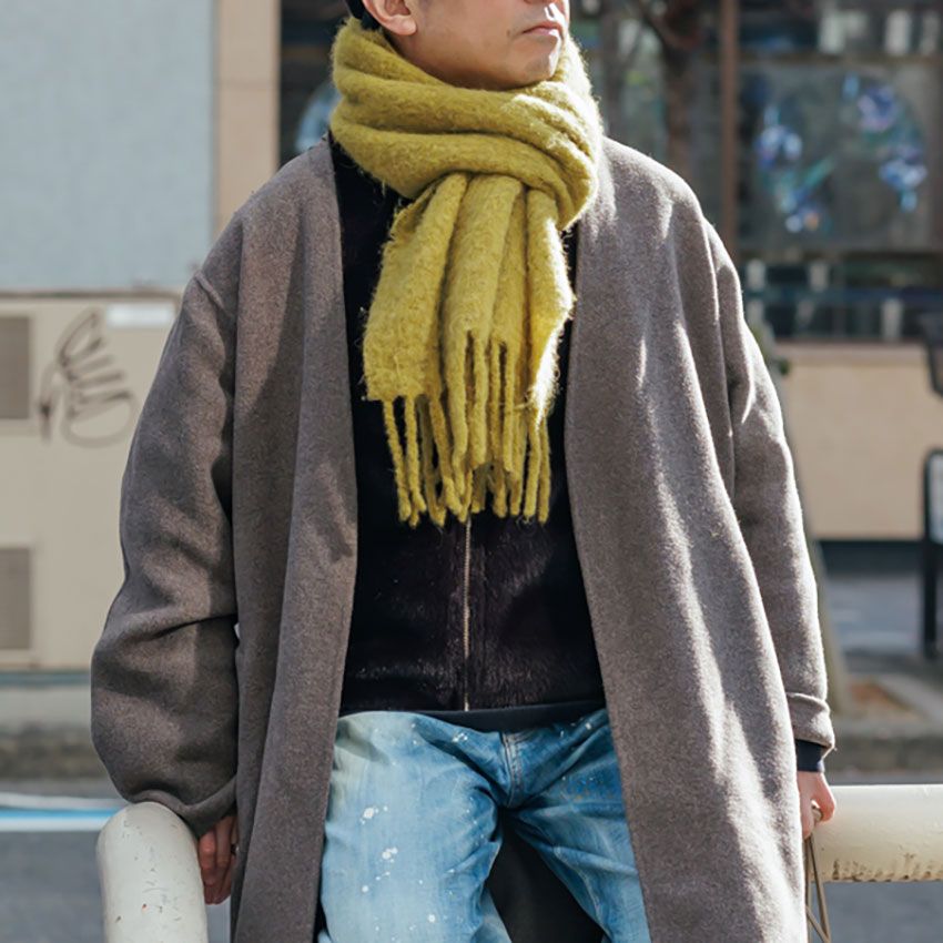 ▶︎よしまささんのスナップをすべて見るよしまささん(46歳)グレージュカラーのノーカラーコートにも負けず劣らず、マイルドな雰囲気を湛えているのが大判のマフラーだ。ボリューム感のある見た目とマスタードイエローの色みが着こなしに温かなアクセントを加えてくれている。