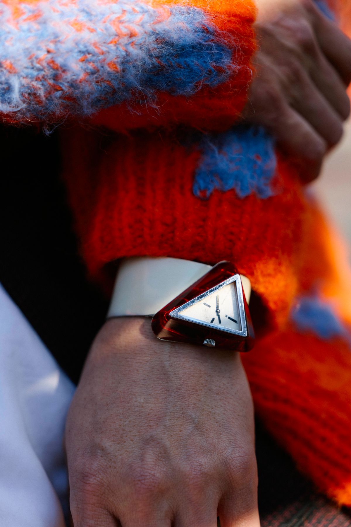 レトロフューチャーな熱量を帯びた唯一無二のフォルムは、アバンギャルドなウェアと共鳴し、時計という枠を超えたオブジェのような存在感を放つ。時代を超越した美意識が、冬の街角に強烈なインパクトを残している。