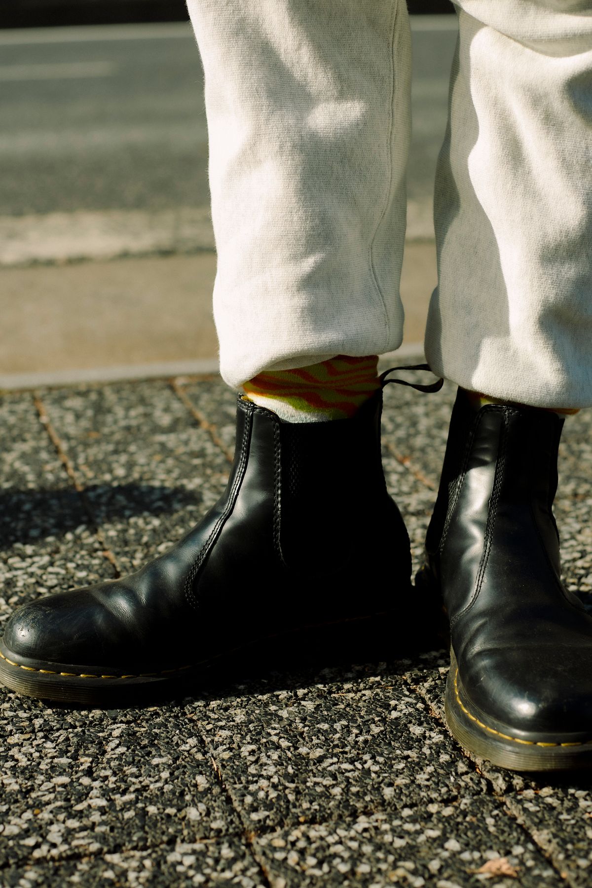 古着のコートを主役に、チャンピオンのパンツで抜け感を作った大瀧さん。一見オーソドックスな合わせに見えて、ハッピーソックスの柄をマーチンの履き口から覗かせる遊び心が心憎い。サイドゴアブーツというチョイスもニクい。ハンドメイドのバッグや個性的な眼鏡といった細部へのこだわりを、どっしりとしたマーチンが受け止めている。50代の貫禄を、遊び心で軽やかに彩った、熟練のパパラッチスタイル。