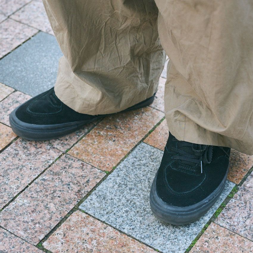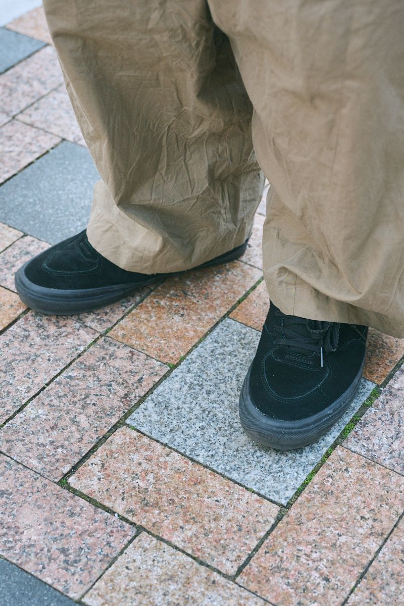 ▶︎イバヤシさんのスナップをすべて見るイバヤシさん(40歳)冬のボリュームある装いに、ヴァンズの名作ハーフキャブをセット。しかも、ソールまで漆黒で統一されたオールブラックを選ぶことで、スケートシューズ特有の武骨さを、都会的でクールな表情へと昇華させている。