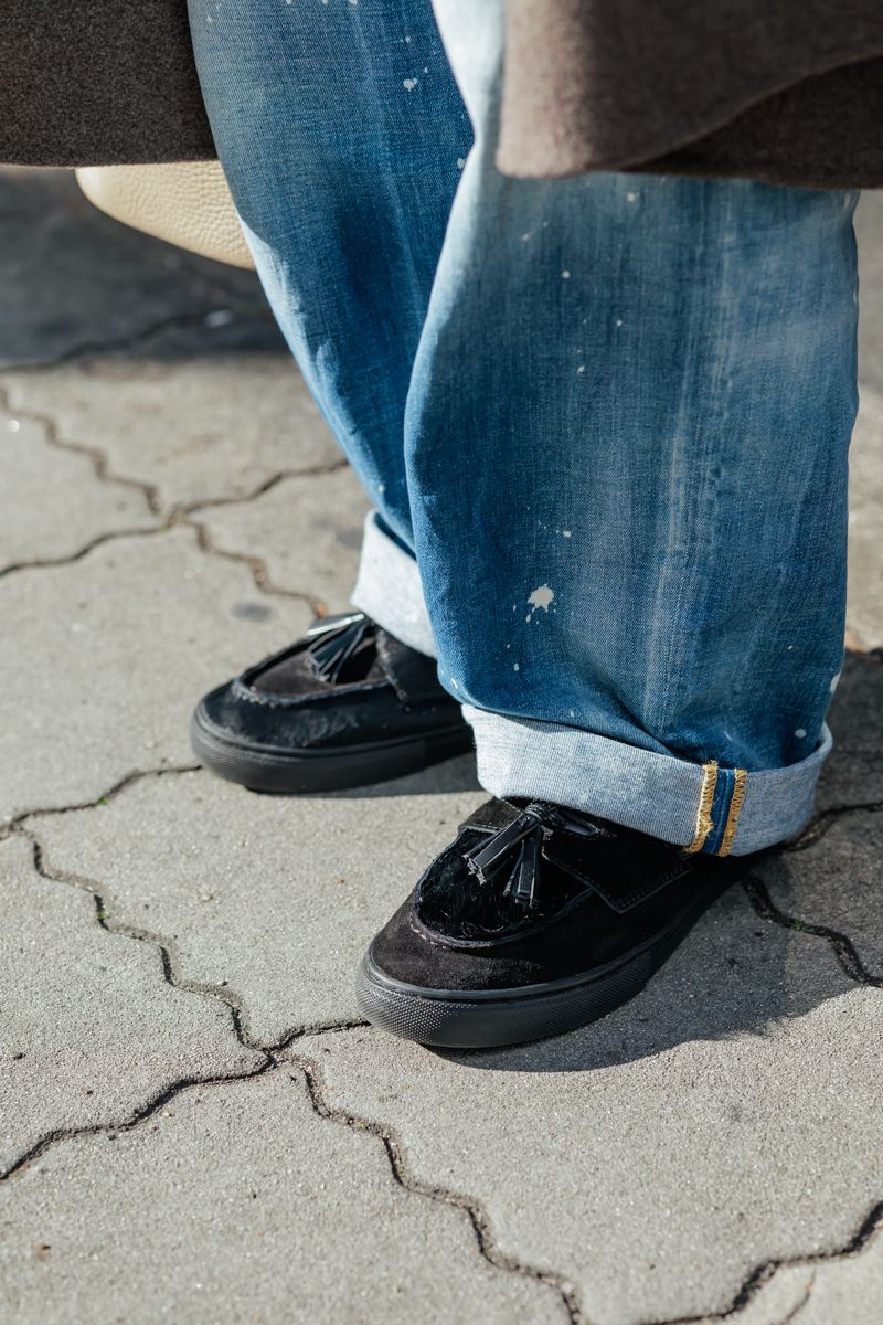 ▶︎よしまささんのスナップをすべて見るよしまささん(46歳)ペイントの入ったタフなデニムに合わせたのは、ヴァンズのなかでも異彩を放つタッセル付きのモデルだ。一見するとクラシックなローファーのようだが、その実ははき慣れたスニーカーというギャップが心憎い。太めのパンツの裾から揺れるタッセルが、武骨なスタイルに絶妙な品格とハズしを添えている。