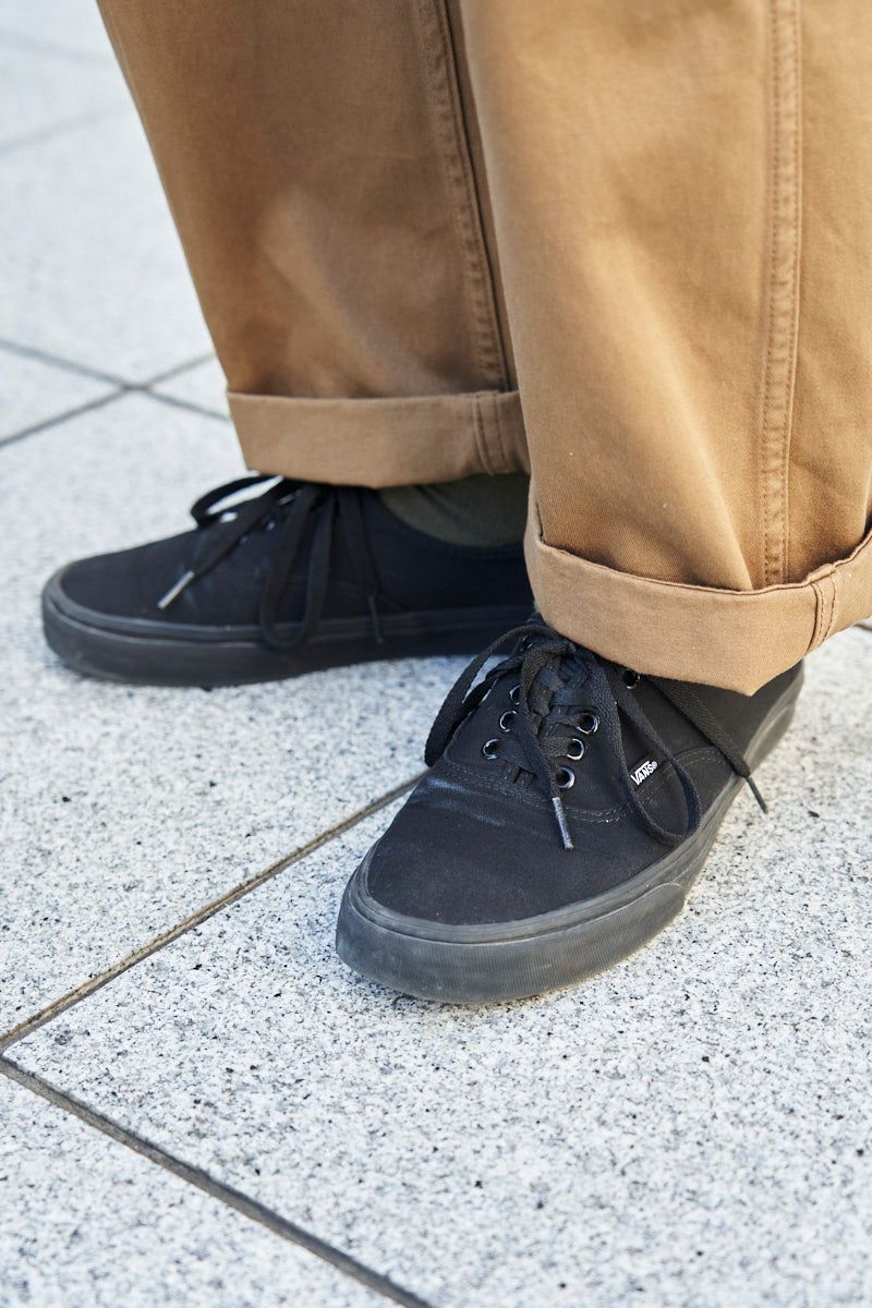 ▶︎相澤さんのスナップをすべて見る相澤健太さん(26歳)ミリタリーテイストの中綿入りジャケットの重厚感を受け止めるのは、ソールまで黒で統一されたヴァンズのスリッポンだ。あえてキャンバスの質感をオールブラックで取り入れることで、スニーカー特有の軽快さを残しつつ、革靴のようなストイックな表情を演出している。