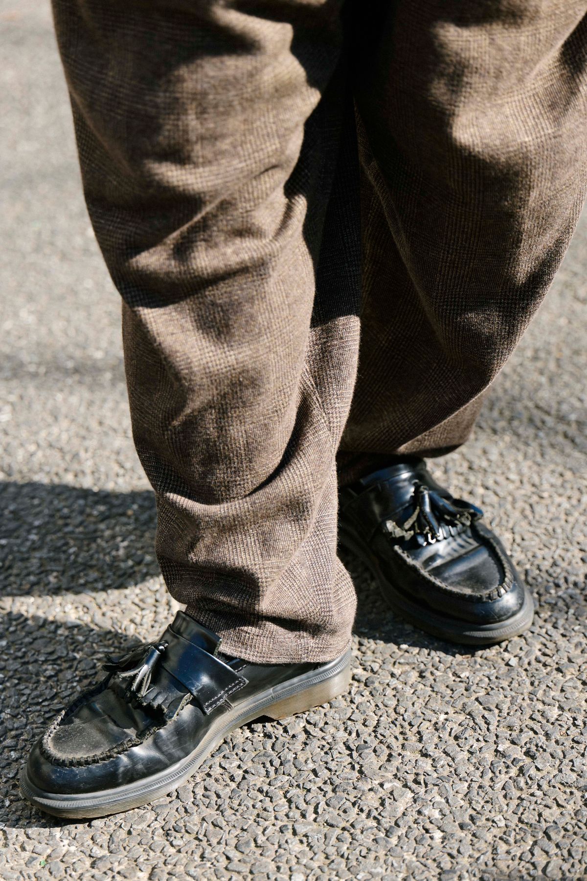 足元はドクターマーチンのローファー、通称“エイドリアン”。ひと目で“マーチン”のそれとわかるタッセルとフリンジが、ボリューミーなスラックスにも負けない個性を放つ。