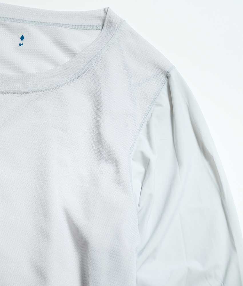 胴体部分は通気性と肌離れの良さが魅力の「ジオライン クールメッシュ」で、腕の部分はストレッチ性が高い薄手のUVカット素材になっている。