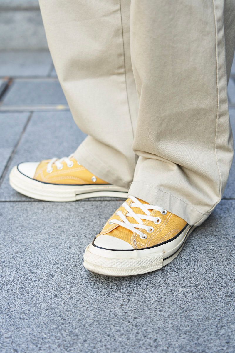 当然の如くニュアンスを付けたハズしイエローの足元からも、繊細な数奇者の矜持が。ミニマルなコーディネイトに見えて、実は仕掛けたっぷり。感服の眼福!