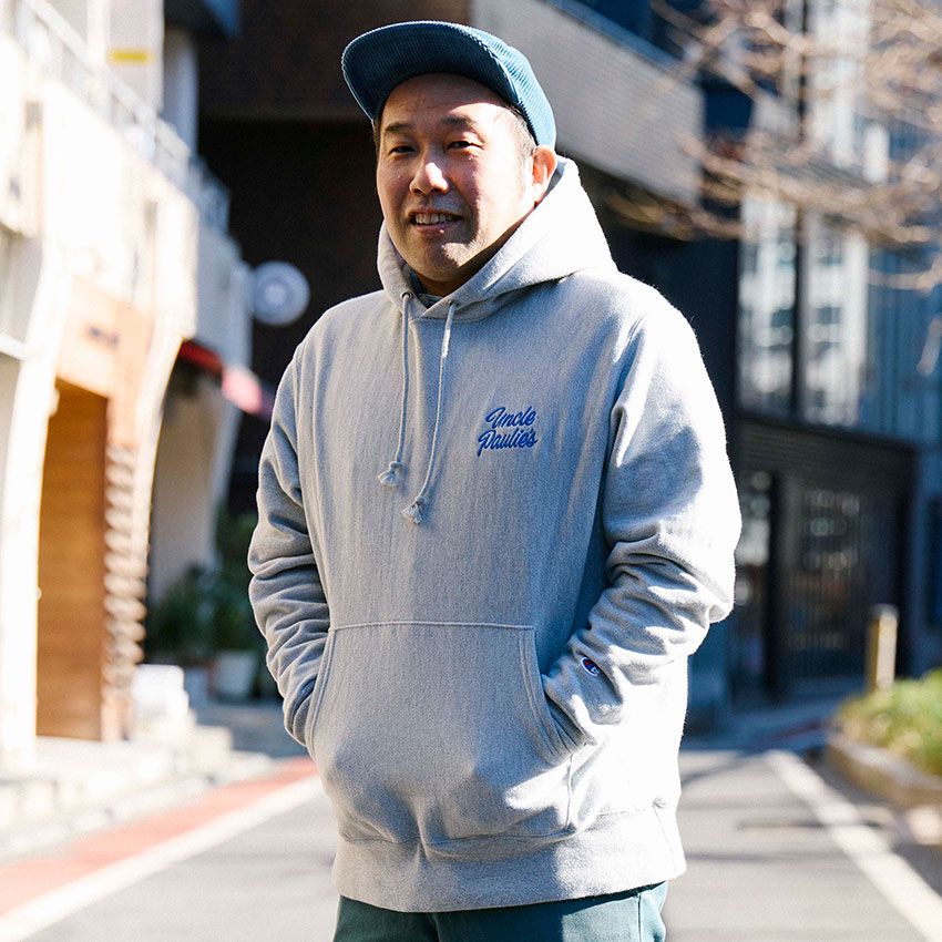 ▶︎鈴木さんのスナップをすべて見る鈴木さん(45歳)カンガルーポケットが付いたチャンピオンのグレースウェットに、ディッキーズのカラーパンツを合わせる。古今、いい大人の休日を気持ち良く支えしワンツーコーデである。