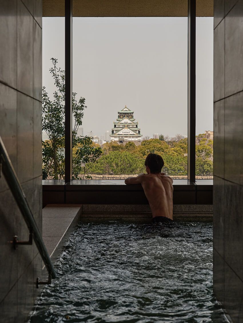 ウェルネスエリアは約1400㎡、テニスコート7面分に及ぶ膨大な広さを誇る。大阪城を望む開放的なワンフロアには、プール、ジム、スパトリートメント、サウナなどが集約されている。