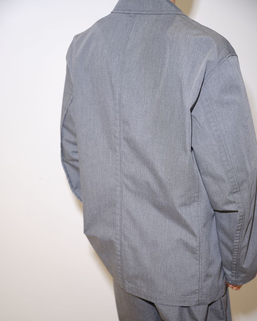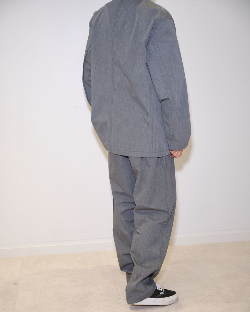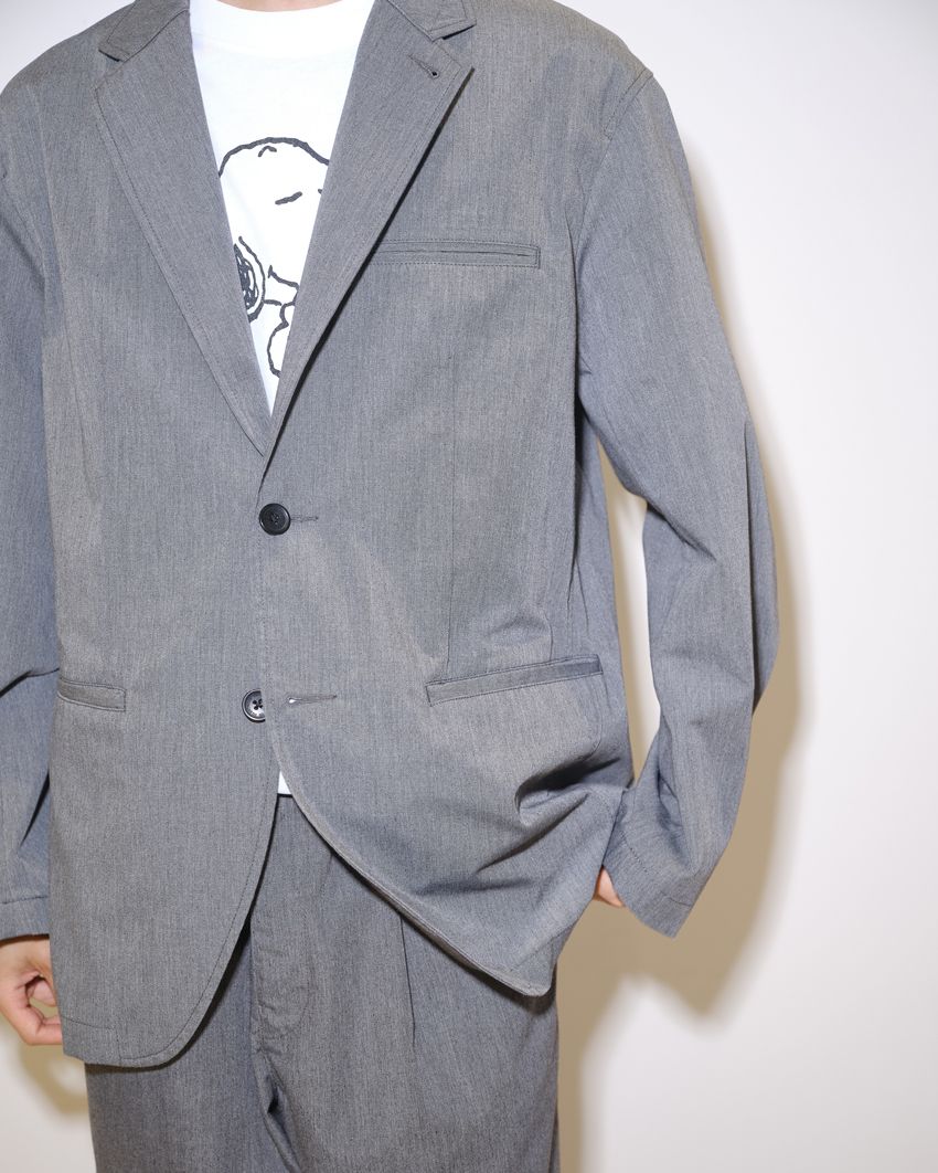 まずご紹介するのは、ポリエステル×コットンの混紡素材に製品洗いがかけられた、軽やかな1枚仕立てのテーラードジャケットと同素材のワイドテーパードパンツ。