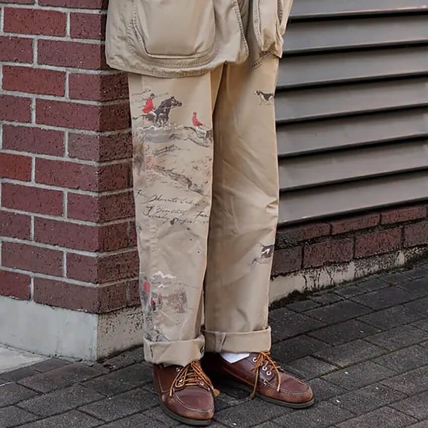 ▶松本さんのスナップをすべて見る松本岳大さん(36歳)オーセンティックなチノーズがベースながら、全面にクラシカルな乗馬シーンが描かれる。ヴィンテージの魅力を熟知する、ラルフ ローレンならではの傑作パンツだ。