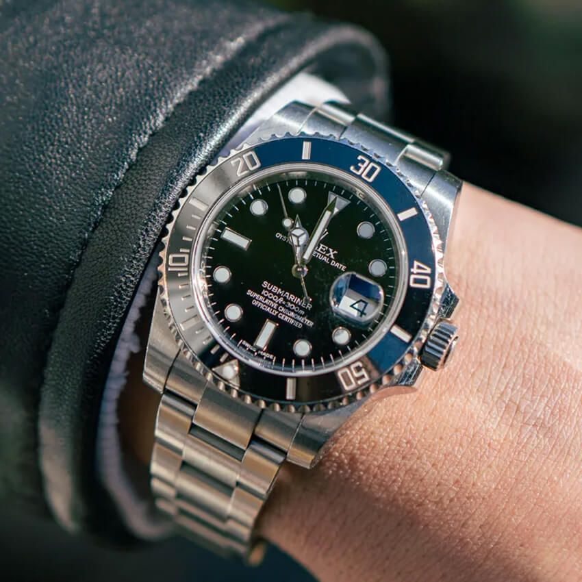 潔く洗練されたカラーコードは、仕上げのロレックスにも踏襲。ダイヤルとベゼルが黒で染められたメタルブレスの「サブマリーナー デイト」。退屈知らずのモノクロに、効果てき面。