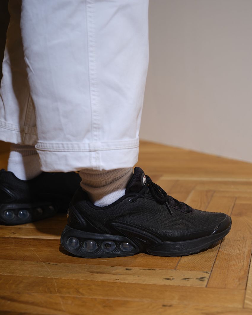足元はテッキーな雰囲気で履き心地も最高な「エア マックス DN」をチョイス。オールブラックでコーデを選ばなさそうな一足だ!