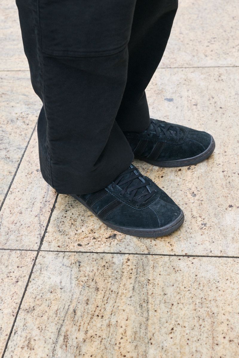 全身を「コモリ」で統一した、大人の余裕漂うワントーンスタイル。絶妙なリラックスシルエットの足元に選んだのは、主張しすぎないアディダス。ソールやスリーストライプまで漆黒の落ち着いた一足だ。上質なウェアの素材感を邪魔せず、都会的な軽快さをプラスしている。