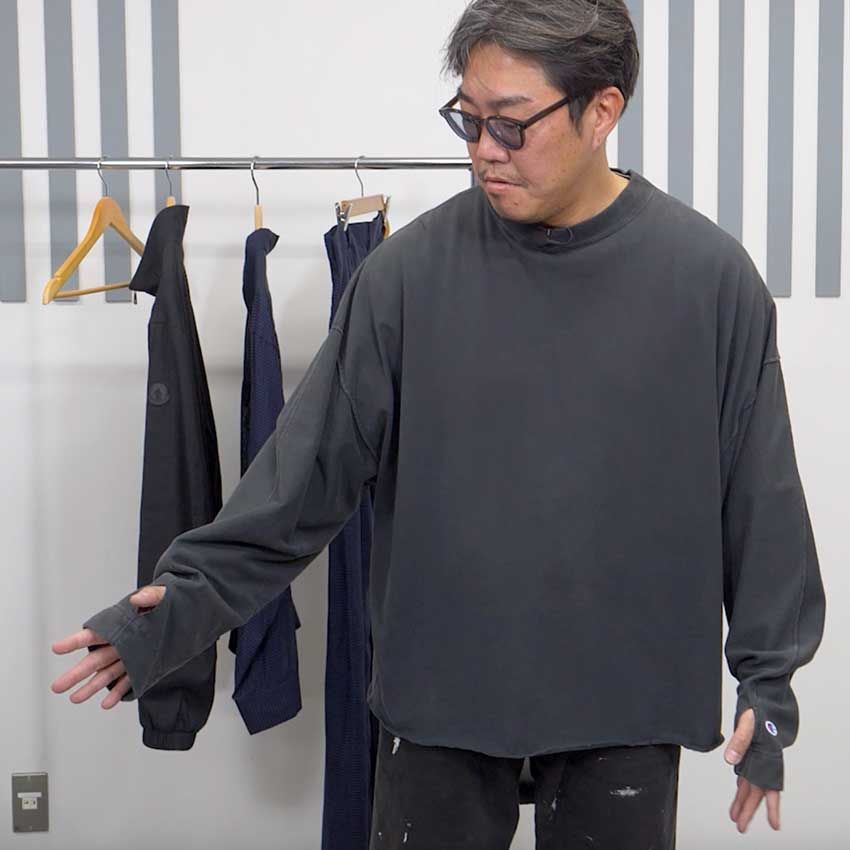 キクチ 重ねるのもいいし、春にちょうどいい素材感だからスウェットは単体でも使えるシーンが多いと思う。サムホール付きだし、着るとわかるけど、内側は涼しいんだよね。