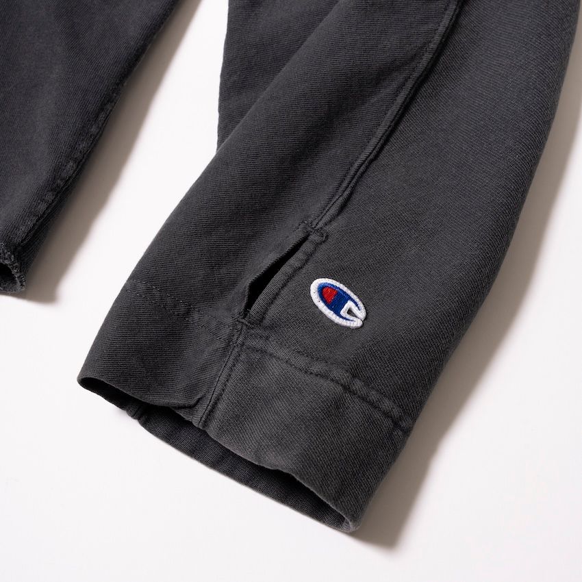 キクチ スウェットのオモテ面にはチャンピオンのロゴが袖口に付いてたけど、裏返すと襟元に変わる。