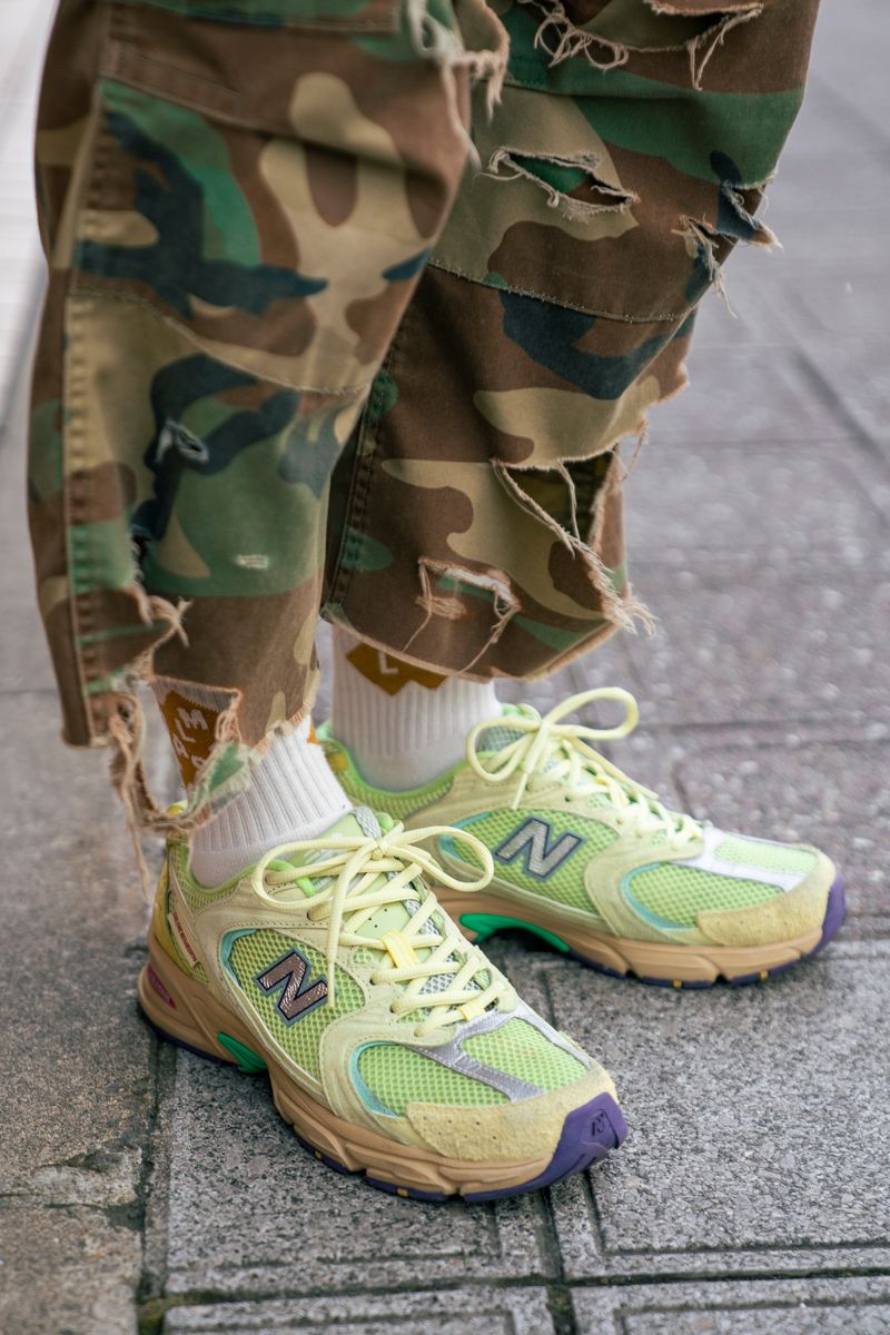 ▶︎中山さんのスナップをすべて見る中山晃樹さん(27歳)アナクロノームのパーカとカーゴパンツによる、ダメージ感のあるタフな装い。特筆すべきは、その足元だ。ニューバランスのネオンイエローのスニーカーを差し込むことで、ミリタリーの土臭さを一気に都会的な表情へと塗り替えている。