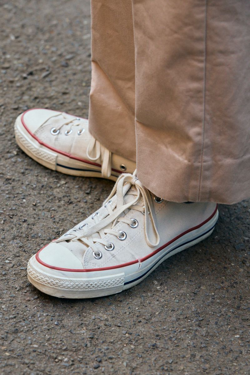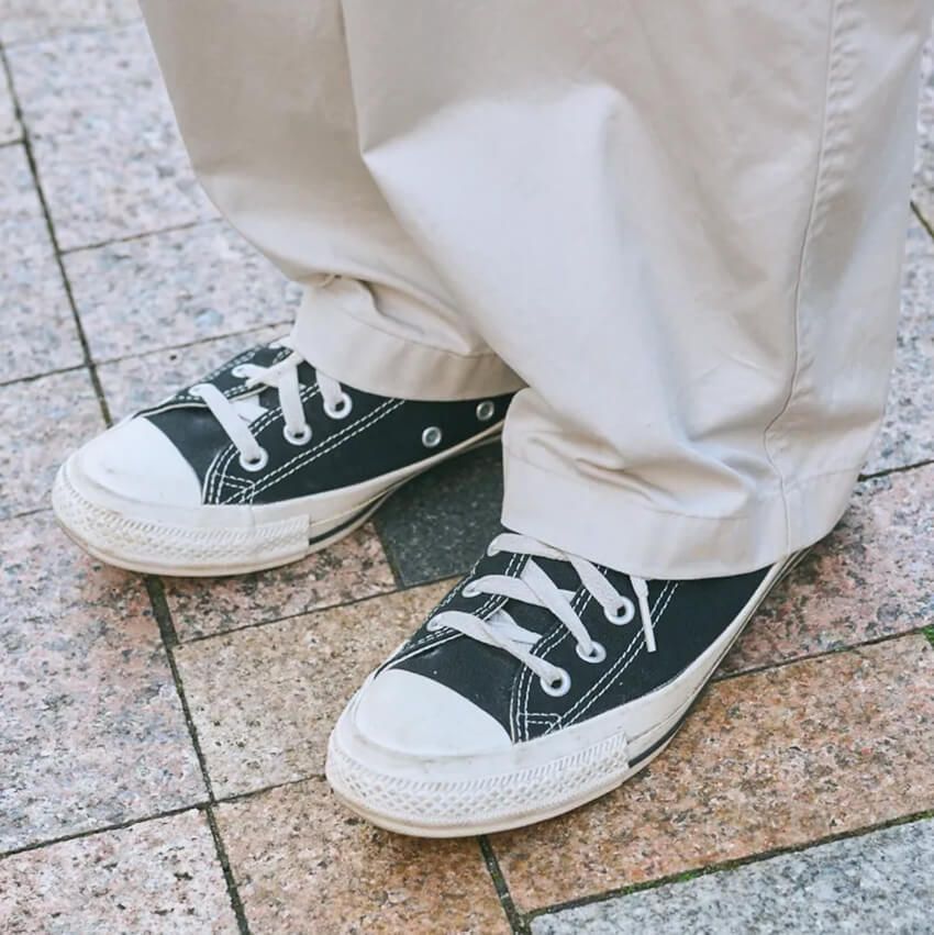ワイドパンツが定番化した今、悩ましいのが「靴」との相性。ボリュームのあるボトムスに対し、シャープな「コンバース」はまさに正解のひとつと言える。