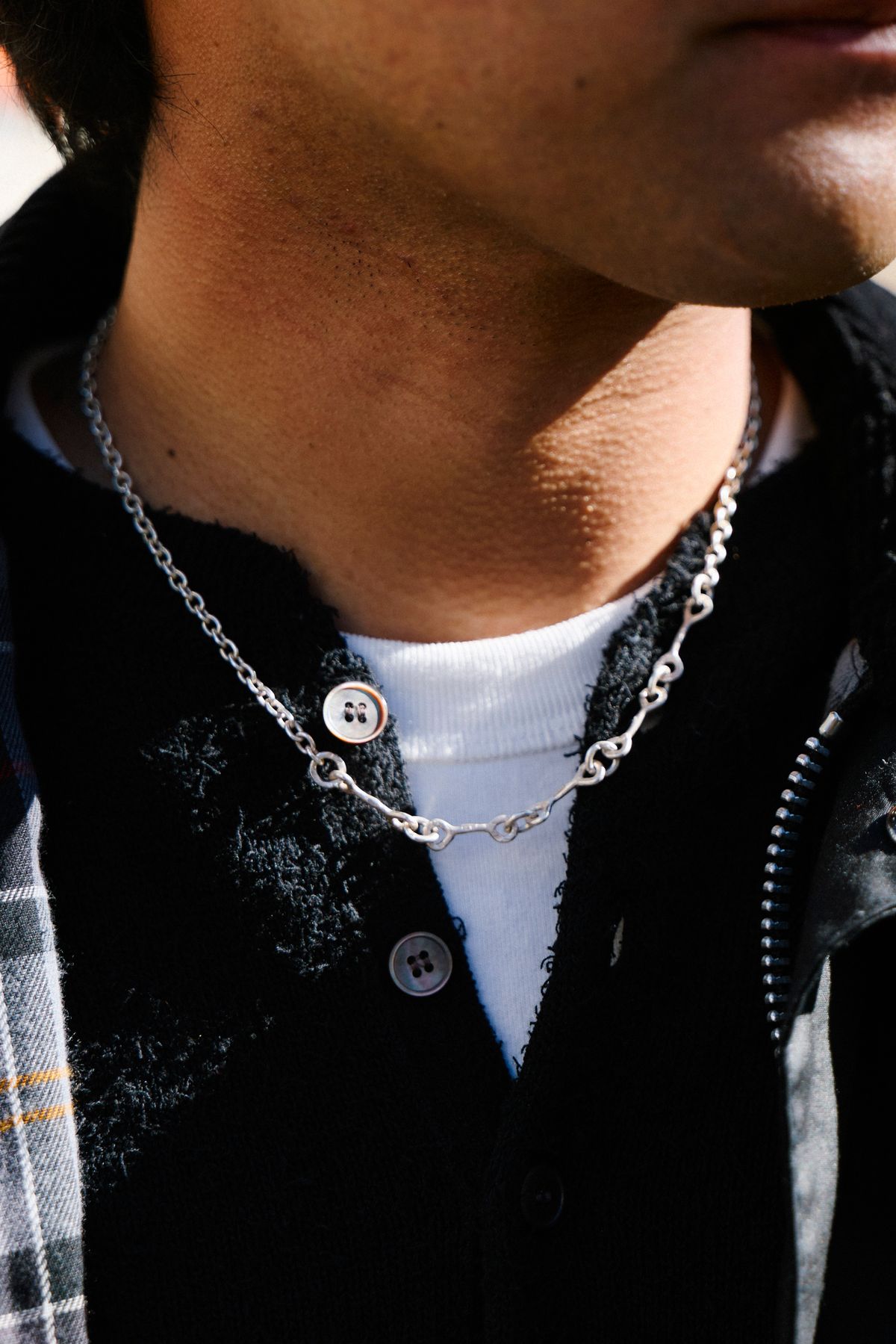 オメガの腕時計を軸に、アンブッシュのブレスレット、そしてクロムハーツとティファニーのリング。異なる個性のシルバーを重ねることで、バブアーの持つ質実剛健なムードに都会的な洗練をプラスしている。まさに“小物で差をつける”を体現した、大人のストリートスタイルの好例だ。