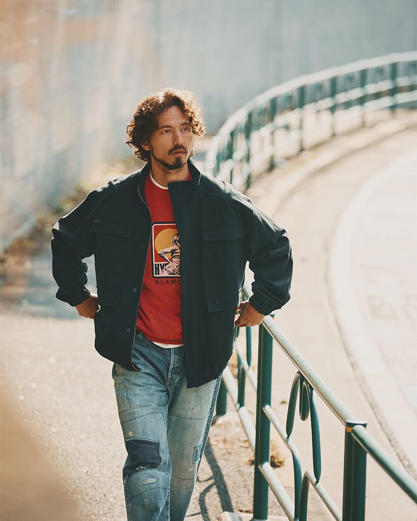 ヴィンテージライクなリペア&ウォッシュ加工を施した、ヒステリックグラマーのブルーデニム。このラギッドな味をぐっと引き立ててくれるのが、クリーンなデザインのフィールドジャケットだ。