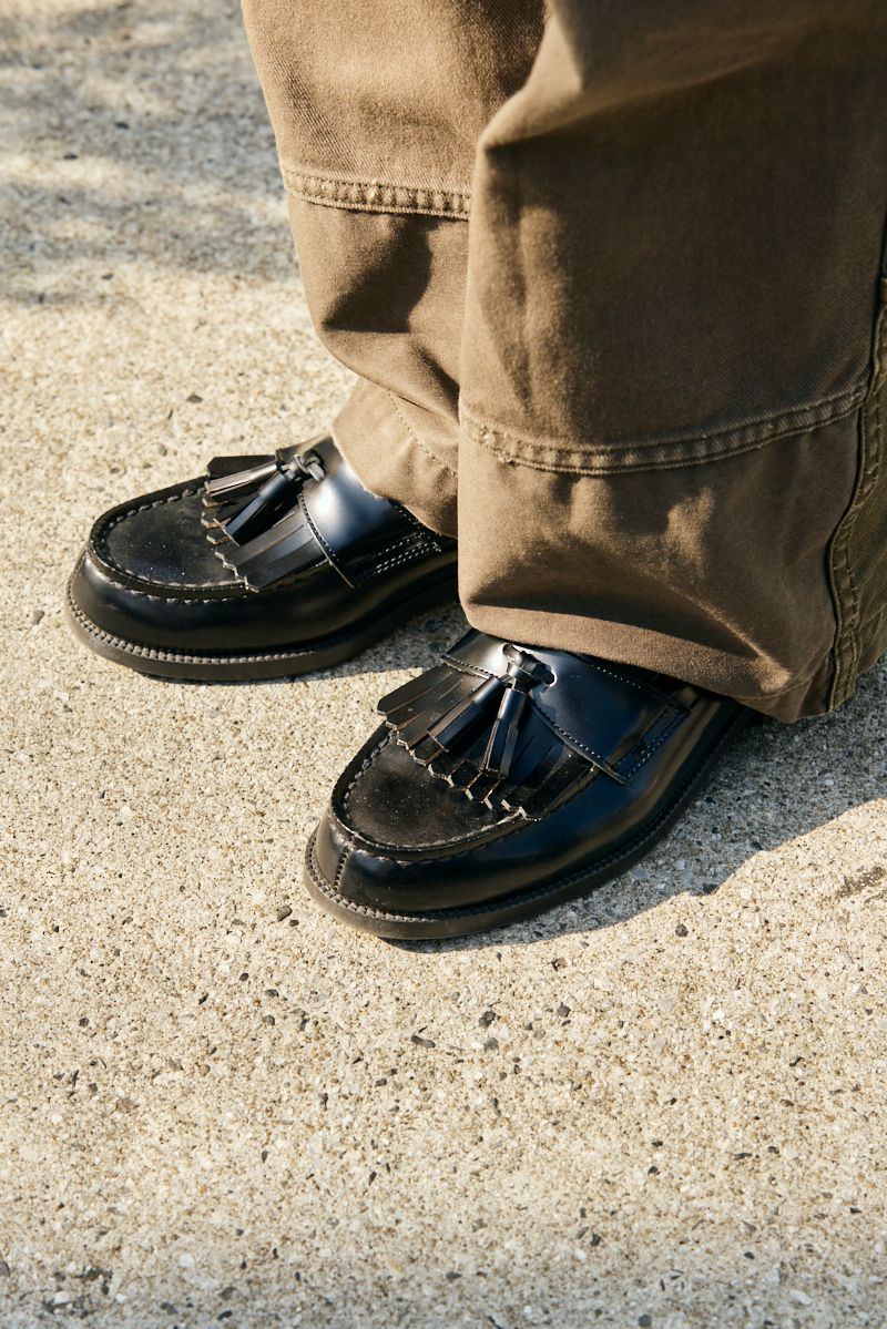 足元はクラシックなタッセルローファーながら、ぽてっとしたフォルムがキュートな印象を引き出す。安定感のあるビジュアルで、太めのパンツとも相性良し。賢者の選択だ。