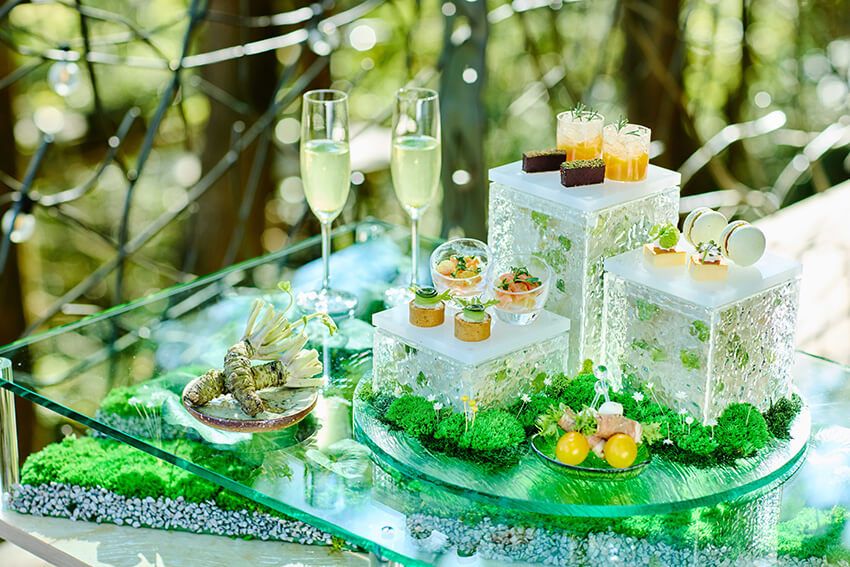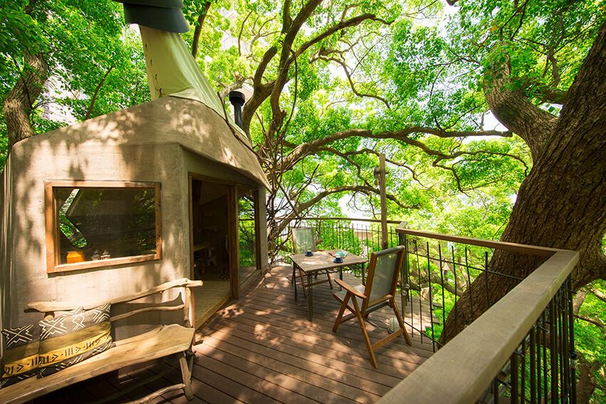 このアフターヌーンティをいただくのは、敷地内にある森のエリア、「森の空中基地 くすくす」の中。樹齢300年を超えるクスノキの上に建てられたツリーハウスを貸し切って緑を感じながら優雅なひとときが過ごしたいものだ。