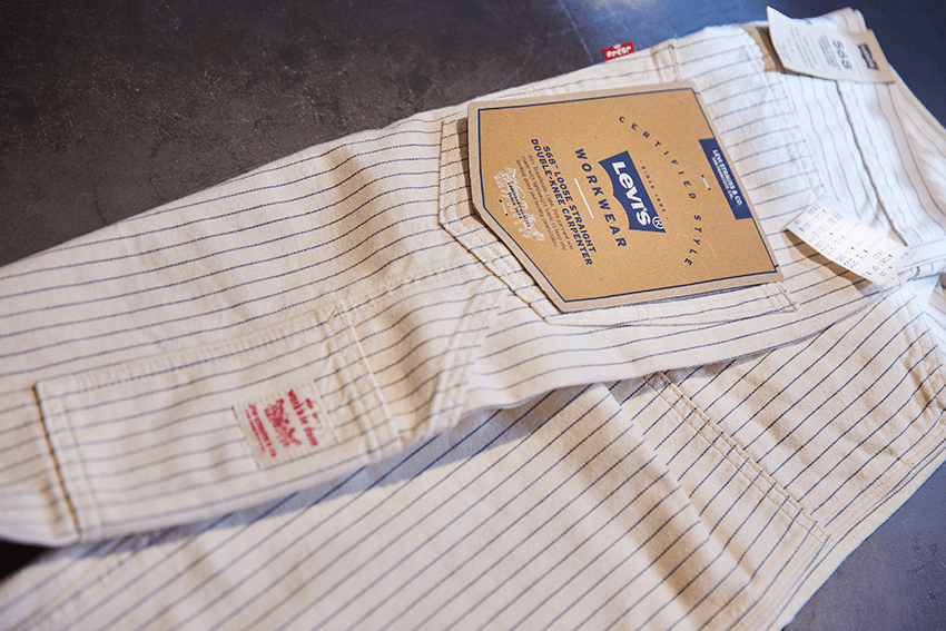 聖空 2本目は、今のワークウェアブームにもぴったりの一着。リーバイス ワークウェアシリーズの「568 ルーズストレート ダブルニー カーペンターパンツ」です。今回はこのヒッコリーストライプを推したいですね。