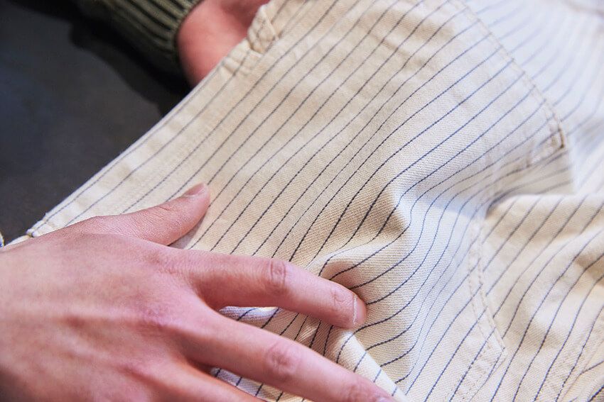 ――具体的に、昔のワークパンツと何が違うんでしょう。聖空 一番は生地感です。昔はガシガシに硬くて重いダック地などが主流でしたが、これはコットンツイルを採用しているので、肌触りがすごく優しいんです。本格的な「ダブルニー」や「ラベル」といったワークウェアのディテールは踏襲しつつも、穿き心地はチノパンのように軽やか。このギャップがたまらないとスタッフからも好評です。