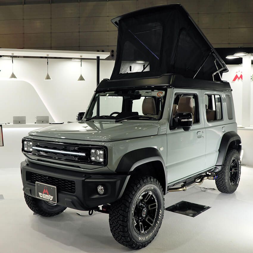 ジムニー・カスタムの老舗であるアピオからは、「アピオジムニーノマド」をピックアップ。オレンジのサイドデカールを挿し色にしたネイビーのノマドは、フロントグリルやアルミホイールなどとも相まって、1970〜80年代の西海岸カルチャーを彷彿させる。