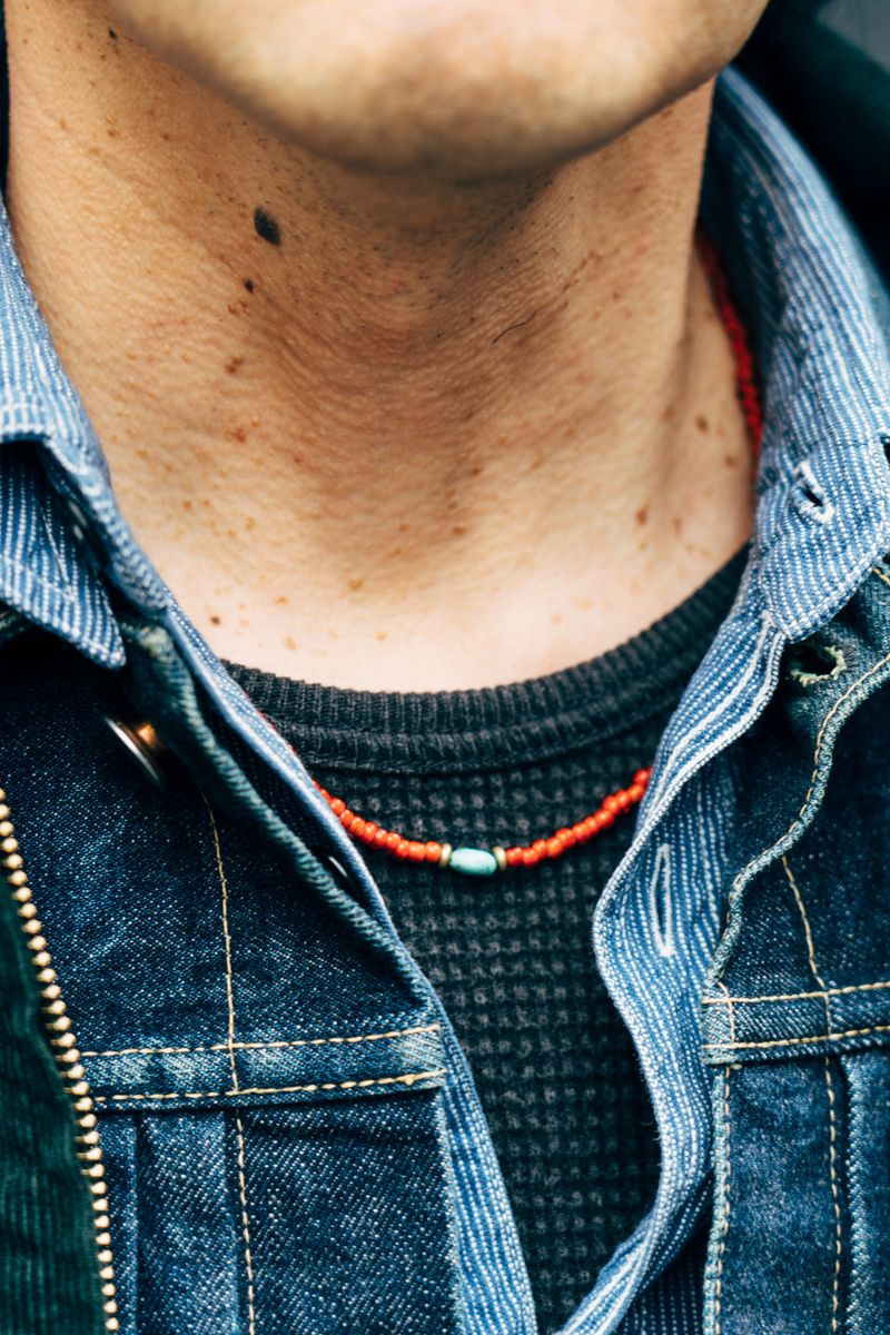 ジャケット=ノースノーネーム Gジャン=ウエアハウス シャツ=シュガーケーン パンツ=レッドキャップ シューズ=ビルケンシュトック 帽子=フラットヘッド ネックレス=不明 ベルト=エイチティーシー