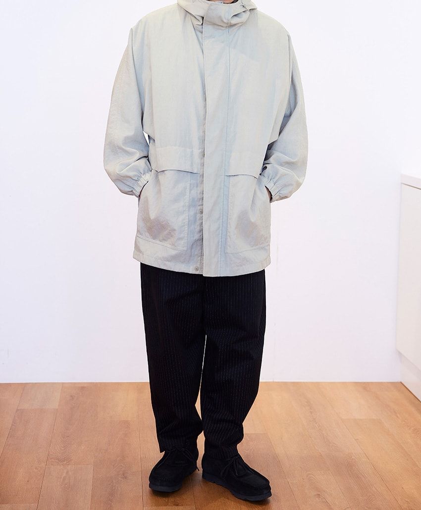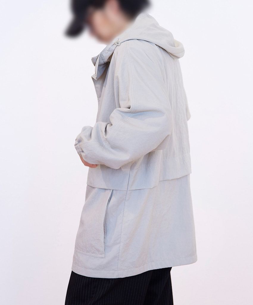 アウトドアパーカをベースにしながら、ドルマンスリーブで独特のシルエットに仕上げた一着。表地は表面に表情のあるナイロンキャンバス、内側はメッシュの総裏仕立てで通気性も良好だ。