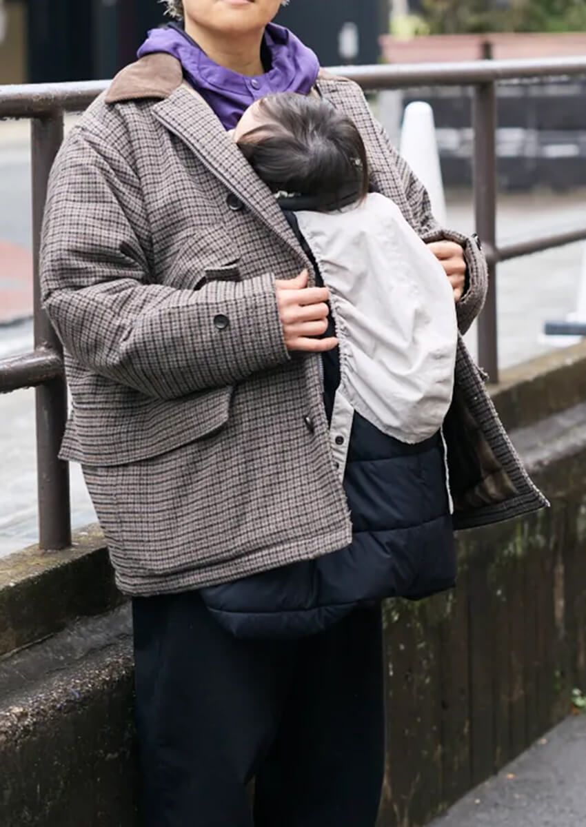 ベビーを抱えたたかひろさんも、その万能性を謳歌。着こなしはシンプルを心がけつつ、インナーのパープルカラーを効かせて遊びもたっぷりに装った。