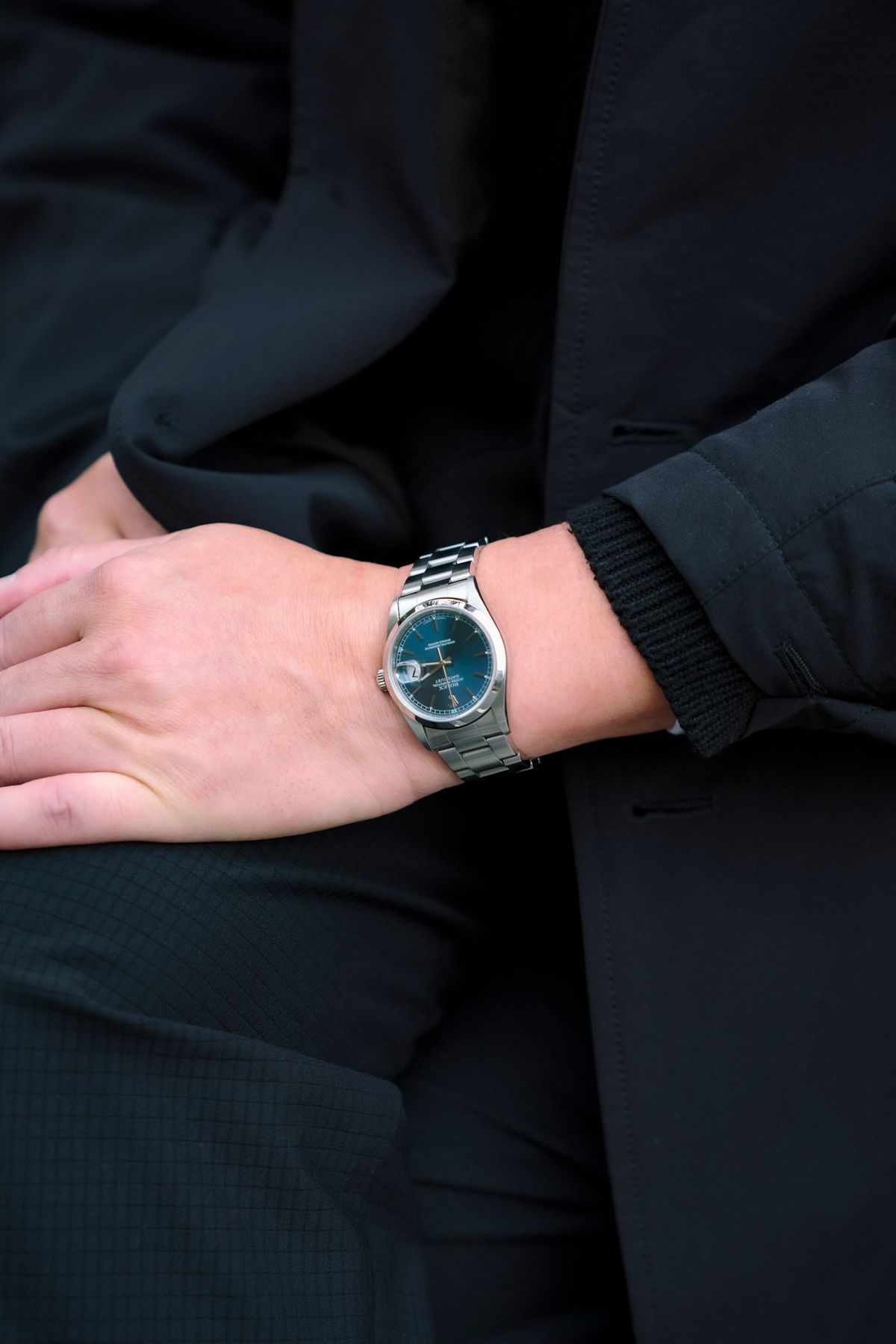 ジャケット=ダイワ ピア39 カットソー=ザラ パンツ=グラフペーパー シューズニューバランス 腕時計=ロレックス 靴下=ヒューマンメイド